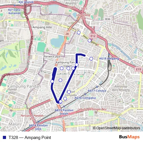 The first stop of the T328 bus route is Flat Taman Bakti (1), Jalan Cempaka and the last stop is Hab Bas Ampang Point, Jalan Ampang. T328 (Ampang Point) is operational during everyday.