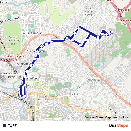 The first stop of the T457 bus route is MRT Stadium Kajang Pintu A and the last stop is MRT Stadium Kajang Pintu A. T457 is operational during everyday.
