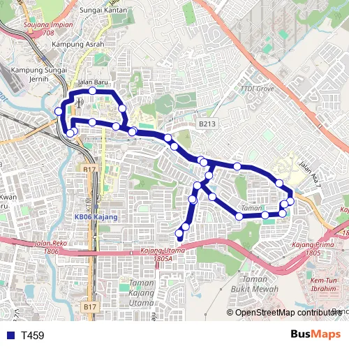 The first stop of the T459 bus route is MRT Stadium Kajang Pintu A and the last stop is MRT Stadium Kajang Pintu A. T459 is operational during everyday.