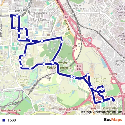 The first stop of the T568 bus route is MRT UPM Pintu A and the last stop is MRT UPM Pintu A. T568 is operational during everyday.