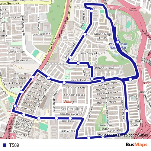 The first stop of the T589 bus route is MRT Taman Naga Emas and the last stop is MRT Taman Naga Emas. T589 is operational during everyday.