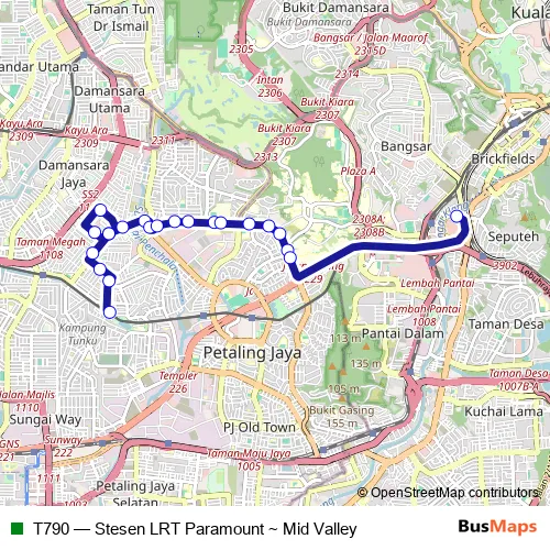 The first stop of the T790 bus route is Pj297 LRT Taman Paramount and the last stop is (M) Kl2147 Midvalley North Court. T790 (Stesen LRT Paramount ~ Mid Valley) is operational during everyday.