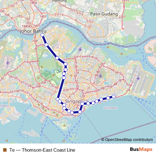 Woodlands North Coast Road - Woodlands Drive 16 - Upper Thomson Road - Ang Mo Kio Avenue 4 - Sin Ming Avenue - Upper Thomson Road - Cluny Road - Orchard Boulevard - Zion Road - South Bridge Road - Park Street - Marina Gardens Drive - Tanjong Rhu Road - Meyer Road - Amber Road - Marine Parade Road - Bayshore Drive