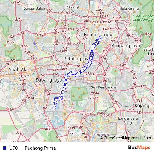 The first stop of the U70 bus route is Pasar Seni, Stesen LRT Pasar Seni and the last stop is Hab Bas Puchong Permai, Pangsapuri Melor (opp.), Persiaran Puhong Permai. U70 (Puchong Prima) is operational during everyday.