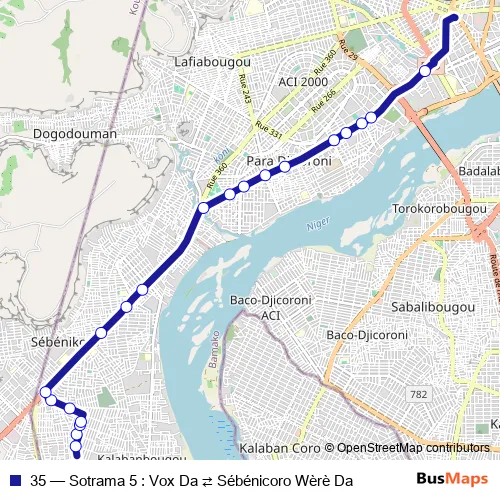 See why over 2 million users trust and consider busmaps.com as the best public transport website. busmaps gives you Bamako Buses suggested routes, real-time bus tracker, line route maps in Bamako, and helps to find the closest 35 bus stops near you. No internet available? Download an offline PDF map and bus schedule for the 35 bus to take on your trip.