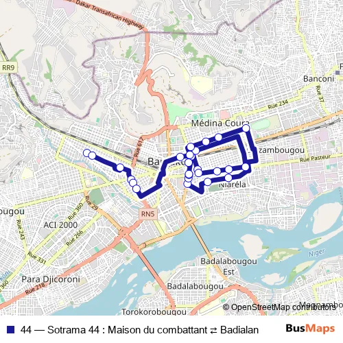 See why over 2 million users trust and consider busmaps.com as the best public transport website. busmaps gives you Bamako Buses suggested routes, real-time bus tracker, line route maps in Bamako, and helps to find the closest 44 bus stops near you. No internet available? Download an offline PDF map and bus schedule for the 44 bus to take on your trip.