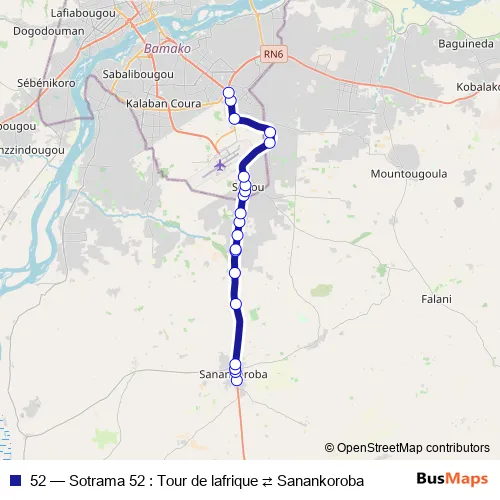 The first stop of the 52 bus route is Sanakoroba Mairie Da and the last stop is Terminus Tour de l'Afrique. 52 (Sotrama 52 : Tour de lafrique ⇄ Sanankoroba) is operational during everyday.