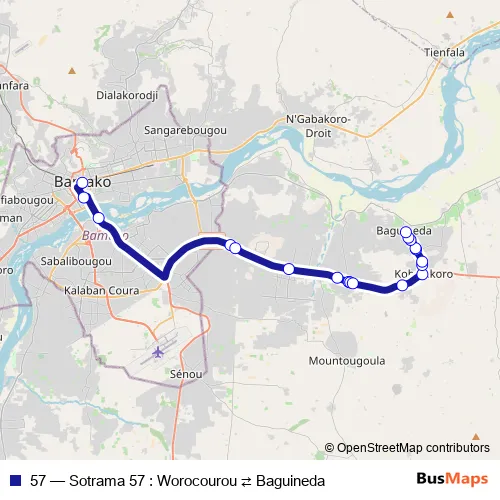 See why over 2 million users trust and consider busmaps.com as the best public transport website. busmaps gives you Bamako Buses suggested routes, real-time bus tracker, line route maps in Bamako, and helps to find the closest 57 bus stops near you. No internet available? Download an offline PDF map and bus schedule for the 57 bus to take on your trip.