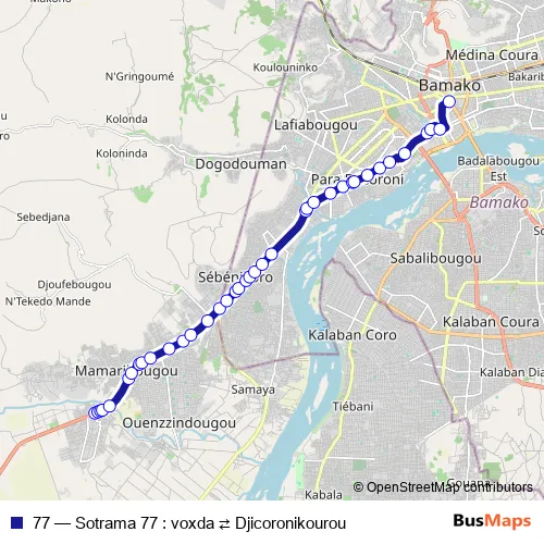 See why over 2 million users trust and consider busmaps.com as the best public transport website. busmaps gives you Bamako Buses suggested routes, real-time bus tracker, line route maps in Bamako, and helps to find the closest 77 bus stops near you. No internet available? Download an offline PDF map and bus schedule for the 77 bus to take on your trip.
