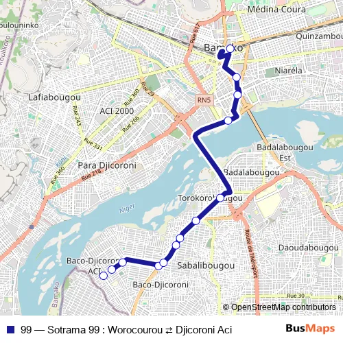 The first stop of the 99 bus route is Kalaban Koro Sirafara and the last stop is Djicoroni ACI Place. 99 (Sotrama 99 : Worocourou ⇄ Djicoroni Aci) is operational during everyday.