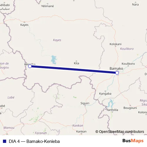 The first stop of the DIA 4 bus route is Bamako Magnambougou and the last stop is Kenieba. DIA 4 (Bamako-Kenieba) is operational during everyday.