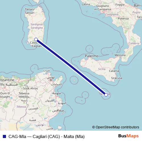 The first stop of the CAG-Mla air route is Aeroporto di Malta (Mla) and the last stop is Aeroporto di Cagliari (CAG) (Elmas). CAG-Mla (Cagliari (CAG) - Malta (Mla)) is operational during everyday.