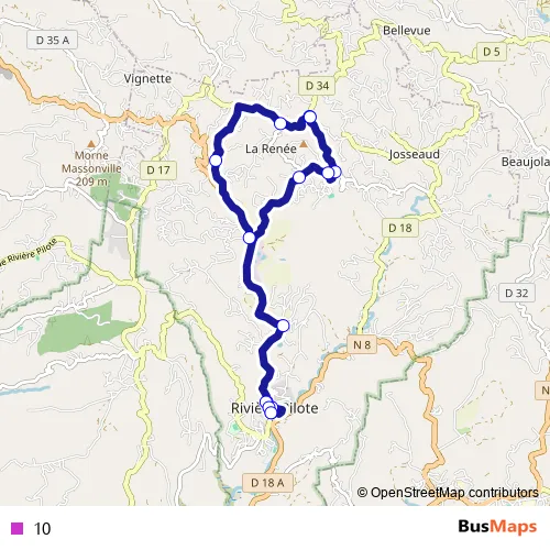 The first stop of the 10 bus route is Riviere Pilote - Gare Routiere and the last stop is Riviere Pilote - Gare Routiere. 10 is operational during everyday.