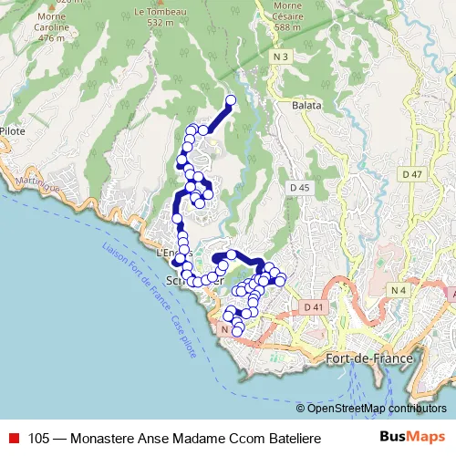 See why over 2 million users trust and consider busmaps.com as the best public transport website. busmaps gives you Fort-de-France Buses suggested routes, real-time bus tracker, line route maps in Fort-de-France, and helps to find the closest 105 bus stops near you. No internet available? Download an offline PDF map and bus schedule for the 105 bus to take on your trip.