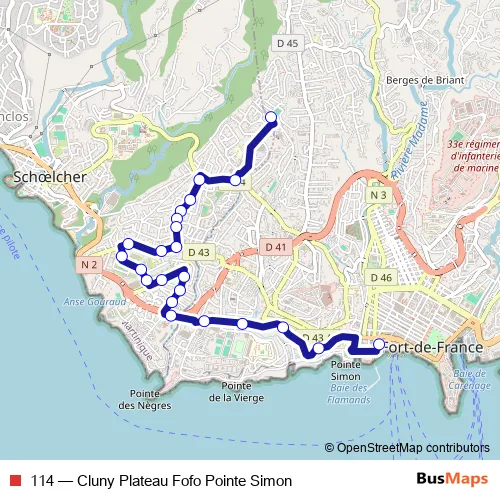 The first stop of the 114 bus route is Stade Victor Géril and the last stop is Pointe Simon. 114 (Cluny Plateau Fofo Pointe Simon) is operational during everyday.