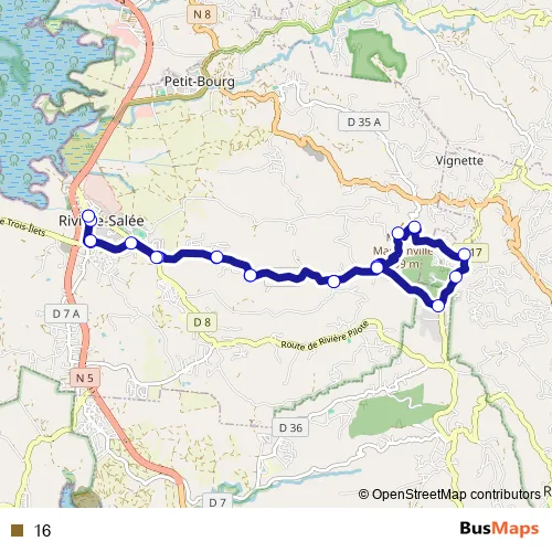 The first stop of the 16 bus route is Riviere Salee - Gare Routiere and the last stop is Riviere Salee - Gare Routiere. 16 is operational during everyday.
