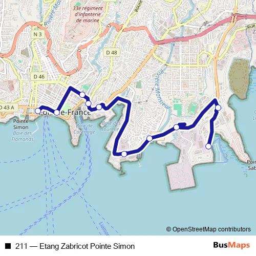 The first stop of the 211 bus route is Port Etang Z'Abricot and the last stop is Pointe Simon. 211 (Etang Zabricot Pointe Simon) is operational during everyday.