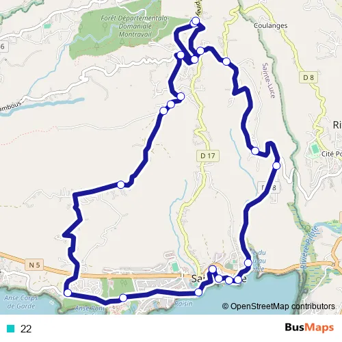 The first stop of the 22 bus route is Sainte Luce - Gare Routiere and the last stop is Sainte Luce - Gare Routiere. 22 is operational during everyday.