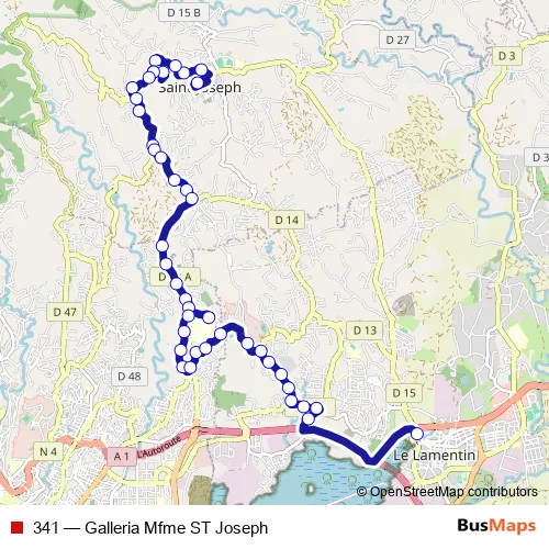 The first stop of the 341 bus route is Gare St Joseph and the last stop is Gare routière de Mahault. 341 (Galleria Mfme ST Joseph) is operational during everyday.