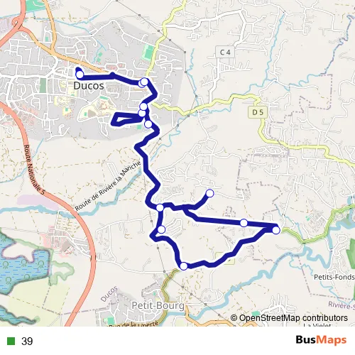 The first stop of the 39 bus route is Ducos - Gare Routiere and the last stop is Ducos - Gare Routiere. 39 is operational during everyday.