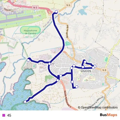 The first stop of the 45 bus route is Ducos - Gare Routiere and the last stop is LE Lamentin - Parking Tcsp Carrere. 45 is operational during everyday.