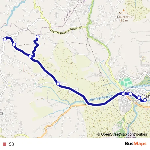 The first stop of the 58 bus route is LE Francois - Gare Routiere and the last stop is LE Francois - Gare Routiere. 58 is operational during everyday.