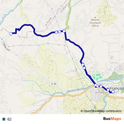 The first stop of the 62 bus route is LE Francois - Gare Routiere and the last stop is LE Francois - Gare Routiere. 62 is operational during everyday.