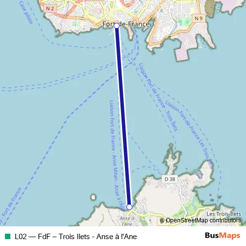 The first stop of the L02 ferry route is Les Trois-Îlets - Anse a l'Ane and the last stop is Fort-de-France - Ponton de la Pointe Simon. L02 (FdF – Trois Ilets - Anse à l'Ane) is operational during everyday.