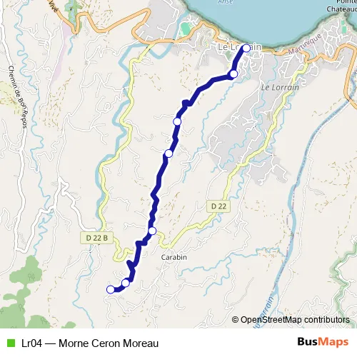 The first stop of the Lr04 bus route is Gare routière du Lorrain and the last stop is Moreau Terminus. Lr04 (Morne Ceron Moreau) is operational during everyday.