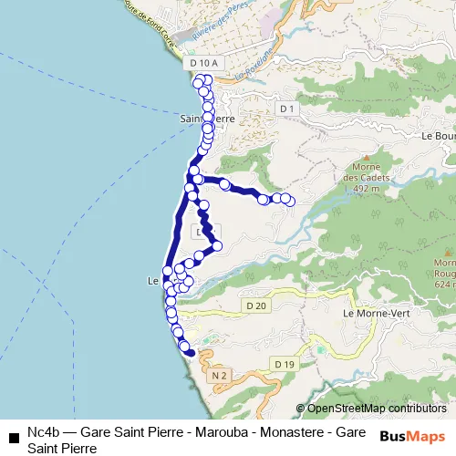 The first stop of the Nc4b bus route is Gare DE Saint Pierre and the last stop is Gare DE Saint Pierre. Nc4b (Gare Saint Pierre - Marouba - Monastere - Gare Saint Pierre) is operational during everyday.