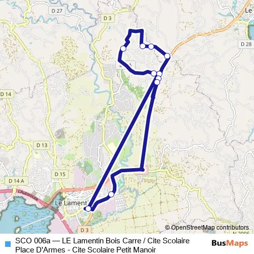 The first stop of the SCO 006a bus route is Lamentin: Depart Petit Manoir and the last stop is Lamentin : Giratoire Pelletier. SCO 006a (LE Lamentin Bois Carre / Cite Scolaire Place D'Armes - Cite Scolaire Petit Manoir) is operational during on weekdays.