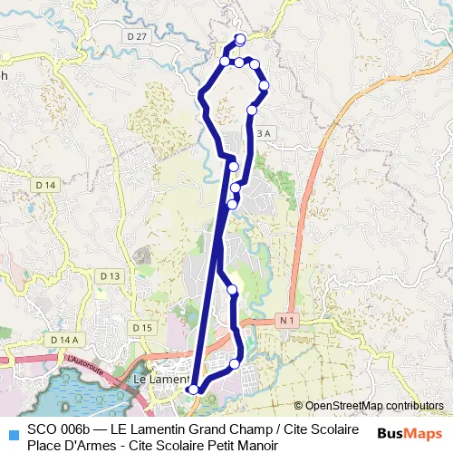 The first stop of the SCO 006b bus route is Lamentin: Depart Petit Manoir and the last stop is Lamentin : Grand Champ Pv. SCO 006b (LE Lamentin Grand Champ / Cite Scolaire Place D'Armes - Cite Scolaire Petit Manoir) is operational during on weekdays.