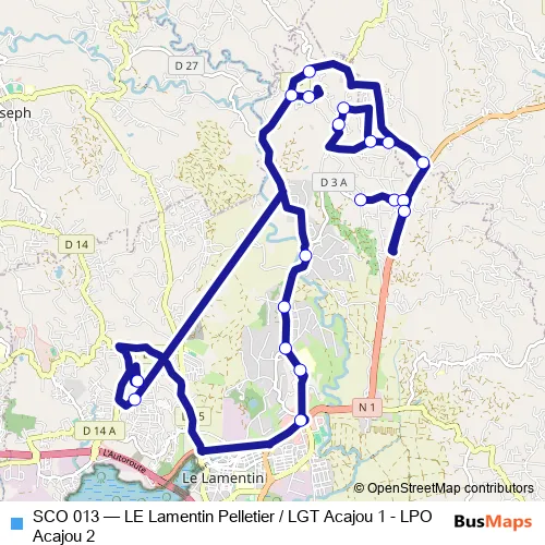 The first stop of the SCO 013 bus route is Lamentin : Lycee Acajou 1 and the last stop is Le Lamentin : Ecole Pelletier. SCO 013 (LE Lamentin Pelletier / LGT Acajou 1 - LPO Acajou 2) is operational during everyday.