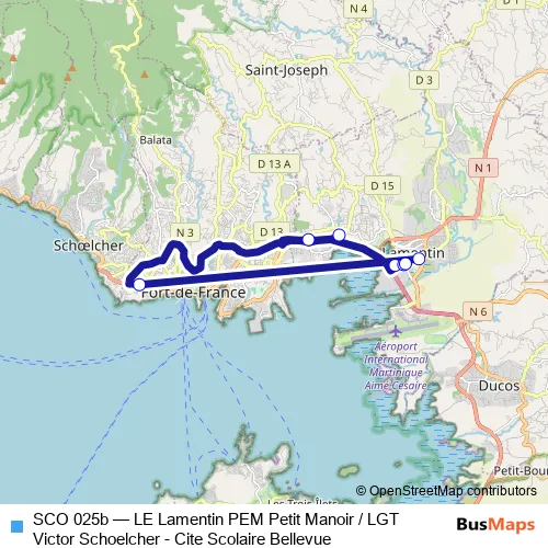 The first stop of the SCO 025b bus route is Etab: Fort-De-France: Lyc Victor Schoelcher and the last stop is Lamentin: Depart Petit Manoir. SCO 025b (LE Lamentin PEM Petit Manoir / LGT Victor Schoelcher - Cite Scolaire Bellevue) is operational during everyday.