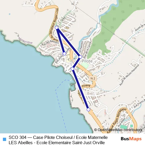 The first stop of the SCO 304 bus route is Case-Pilote : Ecole Elementaire Saint-Just Orville and the last stop is Case-Pilote : Choiseul. SCO 304 (Case Pilote Choiseul / Ecole Maternelle LES Abeilles - Ecole Elementaire Saint-Just Orville) is operational during everyday.