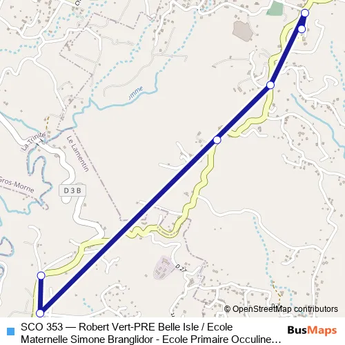 The first stop of the SCO 353 bus route is Lamentin : Belle Isle and the last stop is Robert : Ecole Primaire Occuline Amazan. SCO 353 (Robert Vert-PRE Belle Isle / Ecole Maternelle Simone Branglidor - Ecole Primaire Occuline Amazan) is operational during everyday.