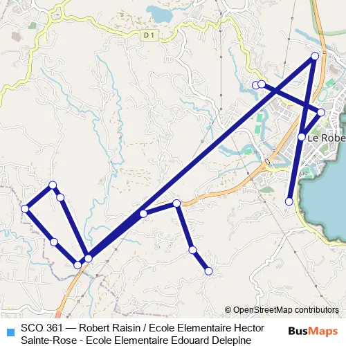 The first stop of the SCO 361 bus route is Robert : Ecole Elementaire Edouard Delepine and the last stop is Robert : Raisin. SCO 361 (Robert Raisin / Ecole Elementaire Hector Sainte-Rose - Ecole Elementaire Edouard Delepine) is operational during on weekdays.
