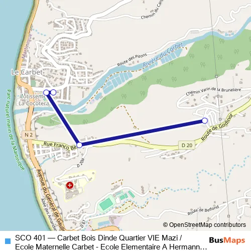 Click here to view the nearest SCO 401 - Carbet Bois Dinde Quartier VIE Mazi / Ecole Maternelle Carbet - Ecole Elementaire A Hermann Michel bus stop.