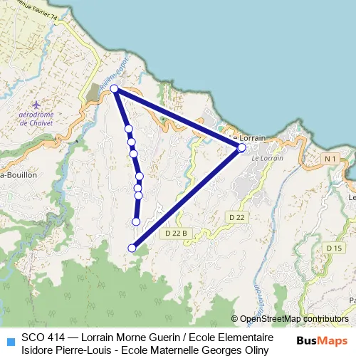 The first stop of the SCO 414 bus route is Lorrain : Ecole Primaire Isidore Pierre-Louis and the last stop is Lorrain : Morne Guerin. SCO 414 (Lorrain Morne Guerin / Ecole Elementaire Isidore Pierre-Louis - Ecole Maternelle Georges Oliny) is operational during everyday.