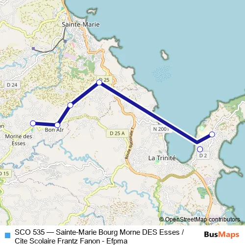 The first stop of the SCO 535 bus route is Etab: Lycees Et Segpa Trinite and the last stop is Sainte-Marie : Bourg Du Morne Des Esses. SCO 535 (Sainte-Marie Bourg Morne DES Esses / Cite Scolaire Frantz Fanon - Efpma) is operational during everyday.