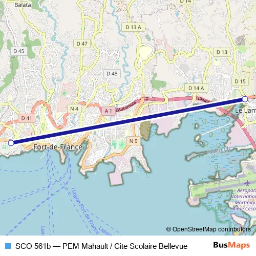 The first stop of the SCO 561b bus route is Fort-De-France : Lycee & Lp Pointe Des Negres and the last stop is Le Lamentin : Pem Mahault. SCO 561b (PEM Mahault / Cite Scolaire Bellevue) is operational during everyday.