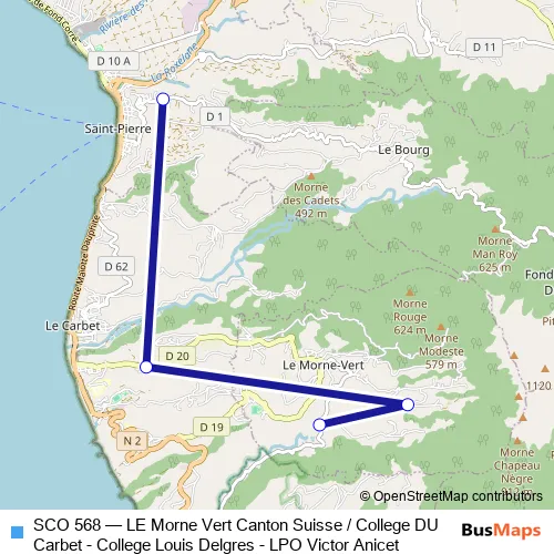 The first stop of the SCO 568 bus route is Saint-Pierre : Lpo Victor Anicet and the last stop is Le Morne-Vert : Canton Suisse. SCO 568 (LE Morne Vert Canton Suisse / College DU Carbet - College Louis Delgres - LPO Victor Anicet) is operational during on weekdays.