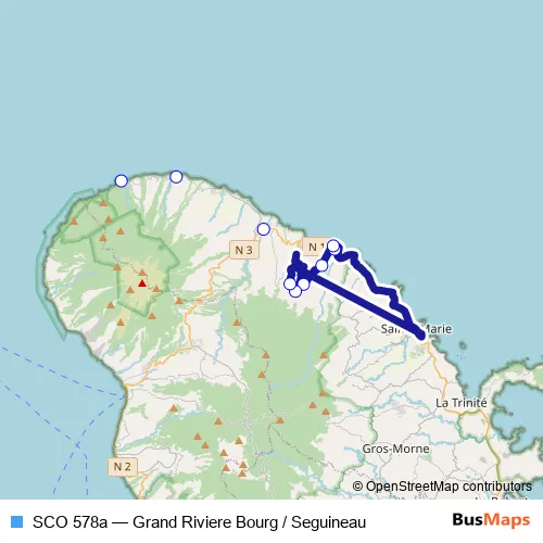 The first stop of the SCO 578a bus route is Lorrain : Tb : Seguineau and the last stop is Grand-Riviere : Bourg De Grand-Riviere. SCO 578a (Grand Riviere Bourg / Seguineau) is operational during on weekdays.