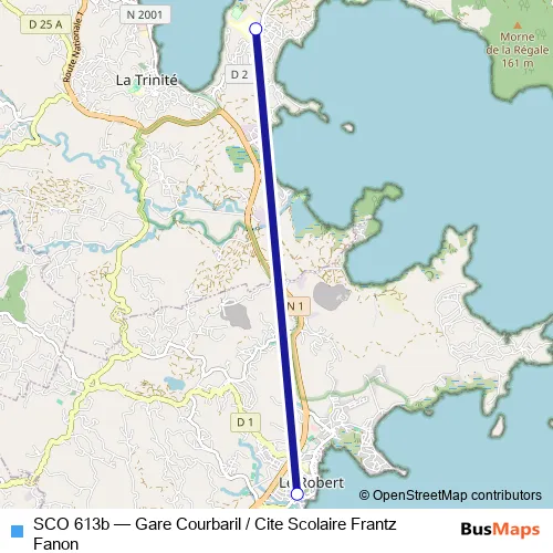 The first stop of the SCO 613b bus route is Trinite : Cite Scolaire Frantz Fanon and the last stop is Le Robert : Gare Courbaril. SCO 613b (Gare Courbaril / Cite Scolaire Frantz Fanon) is operational during everyday.