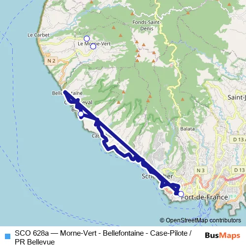 The first stop of the SCO 628a bus route is Fort-De-France : Pr Bellevue and the last stop is Carbet : La Croix Morne-Vert. SCO 628a (Morne-Vert - Bellefontaine - Case-Pilote / PR Bellevue) is operational during everyday.