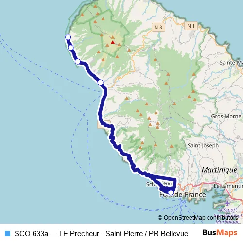 The first stop of the SCO 633a bus route is Fort-De-France : Pr Bellevue and the last stop is Precheur : Anse Belleville. SCO 633a (LE Precheur - Saint-Pierre / PR Bellevue) is operational during everyday.