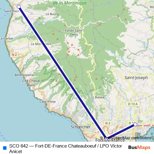 The first stop of the SCO 642 bus route is Saint-Pierre : Lpo Victor Anicet and the last stop is Fort-De-France : La Fee Sylda. SCO 642 (Fort-DE-France Chateauboeuf / LPO Victor Anicet) is operational during on weekdays.