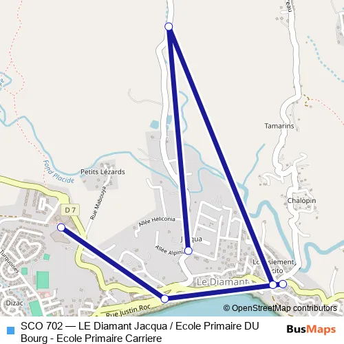 The first stop of the SCO 702 bus route is Le Diamant - Jacqua and the last stop is Le Diamant - Ecole Primaire Carriere. SCO 702 (LE Diamant Jacqua / Ecole Primaire DU Bourg - Ecole Primaire Carriere) is operational during everyday.