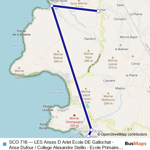The first stop of the SCO 716 bus route is Les Anses d'Arlet - Ecole Primaire Jacques Lucea and the last stop is Les Anses d'Arlet - Ecole de Gallochat. SCO 716 (LES Anses D Arlet Ecole DE Gallochat - Anse Dufour / College Alexandre Stellio - Ecole Primaire Jacques Lucea) is operational during on weekdays.