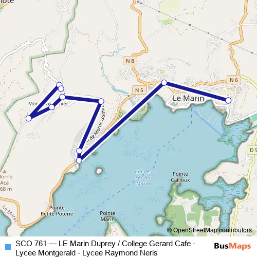 The first stop of the SCO 761 bus route is Le Marin - College Gerard Cafe and the last stop is Le Marin - Boucan. SCO 761 (LE Marin Duprey / College Gerard Cafe - Lycee Montgerald - Lycee Raymond Neris) is operational during everyday.